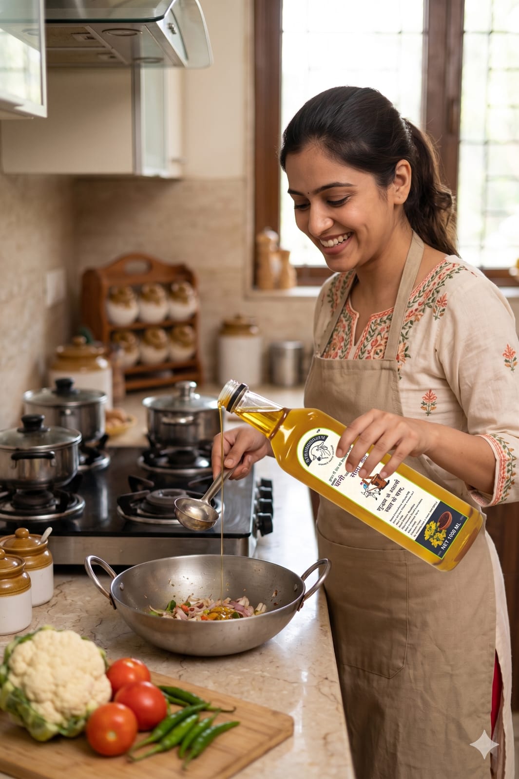 GAU SHUDDHAM Wood Pressed Mustard Oil is extracted using the traditional Kachi Ghani method in a wooden mortar and pestle. By avoiding heat and chemical solvents, we preserve the oil’s intense aroma, deep golden color, and sharp, authentic flavor.