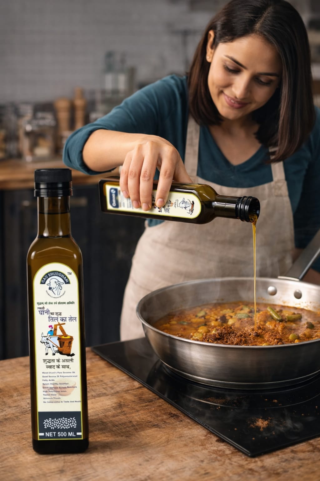 Our Wood-Pressed Sesame (Tilli) Oil is extracted using traditional wooden Ghani at low speeds to preserve essential nutrients. Rich in antioxidants and healthy fats, it is perfect for heart-healthy cooking, Ayurvedic massage, and daily oil pulling. 100% Pure, Natural, and Chemical-Free.